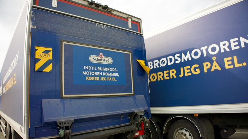 Schulstad ser grønt. Elekstriske lastbiler fyldt med brød.